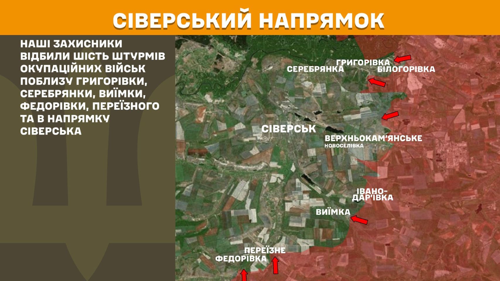 На Сіверському напрямку наші захисники відбили шість штурмів окупаційних військ поблизу Григорівки, Серебрянки, Виїмки, Федорівки, Переїзного та в напрямку Сіверська.