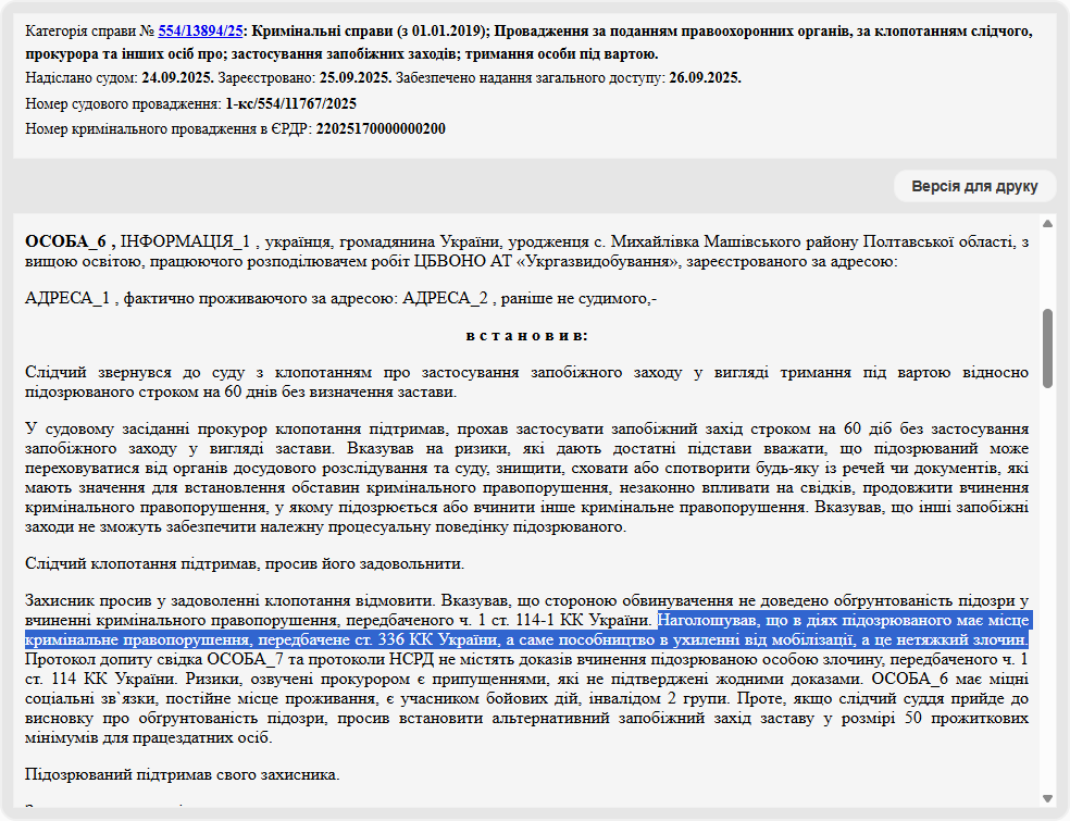 Запобіжний захід для Ляшенка також обирав Шевченківський райсуд Полтави 24 вересня. Чоловік та його адвокат не погоджувалися з висунутою підозрою та наполягали, що максимум — це пособництво в ухиленні від мобілізації (ст. 336 ККУ), а це є нетяжким злочином.