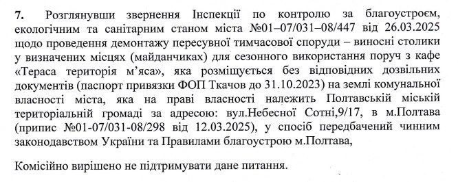 3 вересня відбулося засідання міської комісії з розміщення тимчасових споруд для ведення підприємницької діяльності. Зокрема учасники засідання розглянули звернення Інспекції з благоустрою ще від 26 березня 2025 року щодо демонтажу літнього майданчика біля кафе «Тераса територія м’яса» на вул. Небесної сотні, 9/17, який розміщений без дозвільних документів (паспорт прив’язки ФОП Ткачов був чинний до 31 жовтня 2023 року).