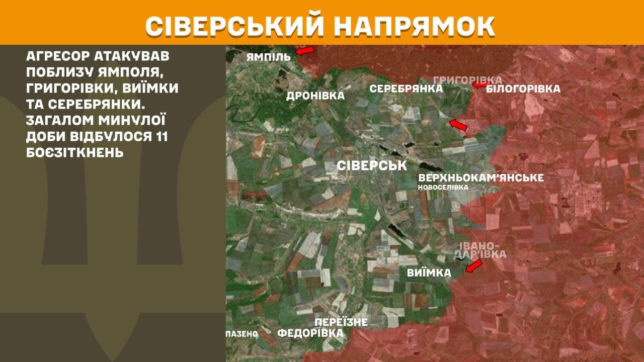 На Сіверському напрямку агресор атакував поблизу Ямполя, Григорівки, Виїмки та Серебрянки. Загалом минулої доби відбулося 11 боєзіткнень.