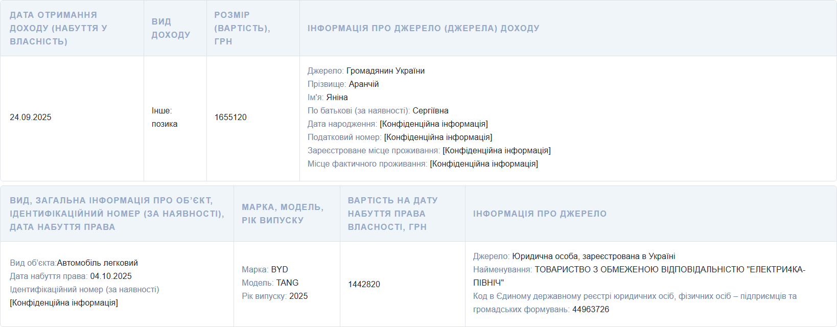 Яніна Аранчій позичила 1,6 млн грн на авто фігуранту розслідування щодо незаконного збагачення