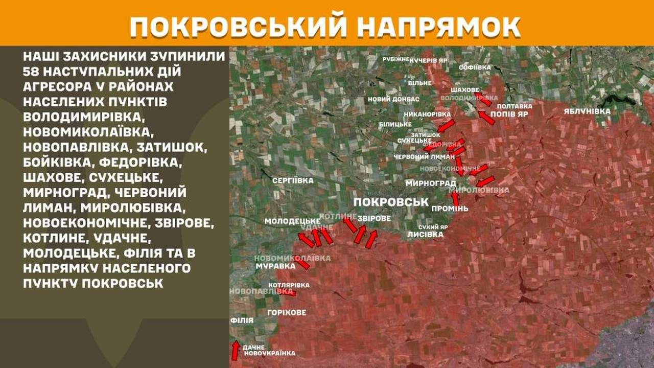 На Покровському напрямку наші захисники зупинили 58 наступальних дій агресора у районах населених пунктів Володимирівка, Новомиколаївка, Новопавлівка, Затишок, Бойківка, Федорівка, Шахове, Сухецьке, Мирноград, Червоний Лиман, Миролюбівка, Новоекономічне, Звірове, Котлине, Удачне, Молодецьке, Філія та в напрямку населеного пункту Покровськ.