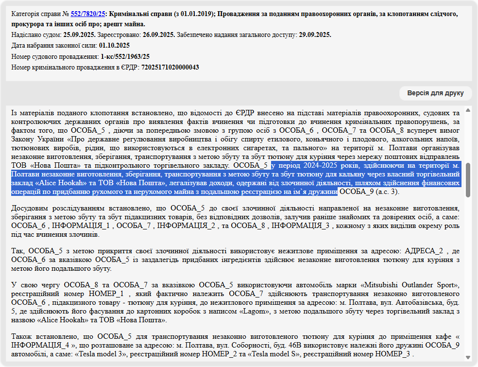 За даними досудового слідства, власник полтавського кальян-бару «Alice Hookah» у змові з трьома довіреними особами у 2024-2025 роках організував в Полтаві незаконне виготовлення та збут тютюну для кальяну. Продаж фальсифікату здійснювався як через кур’єрську службу «Нова Пошта», так і безпосередньо в кальян-барі організатора.