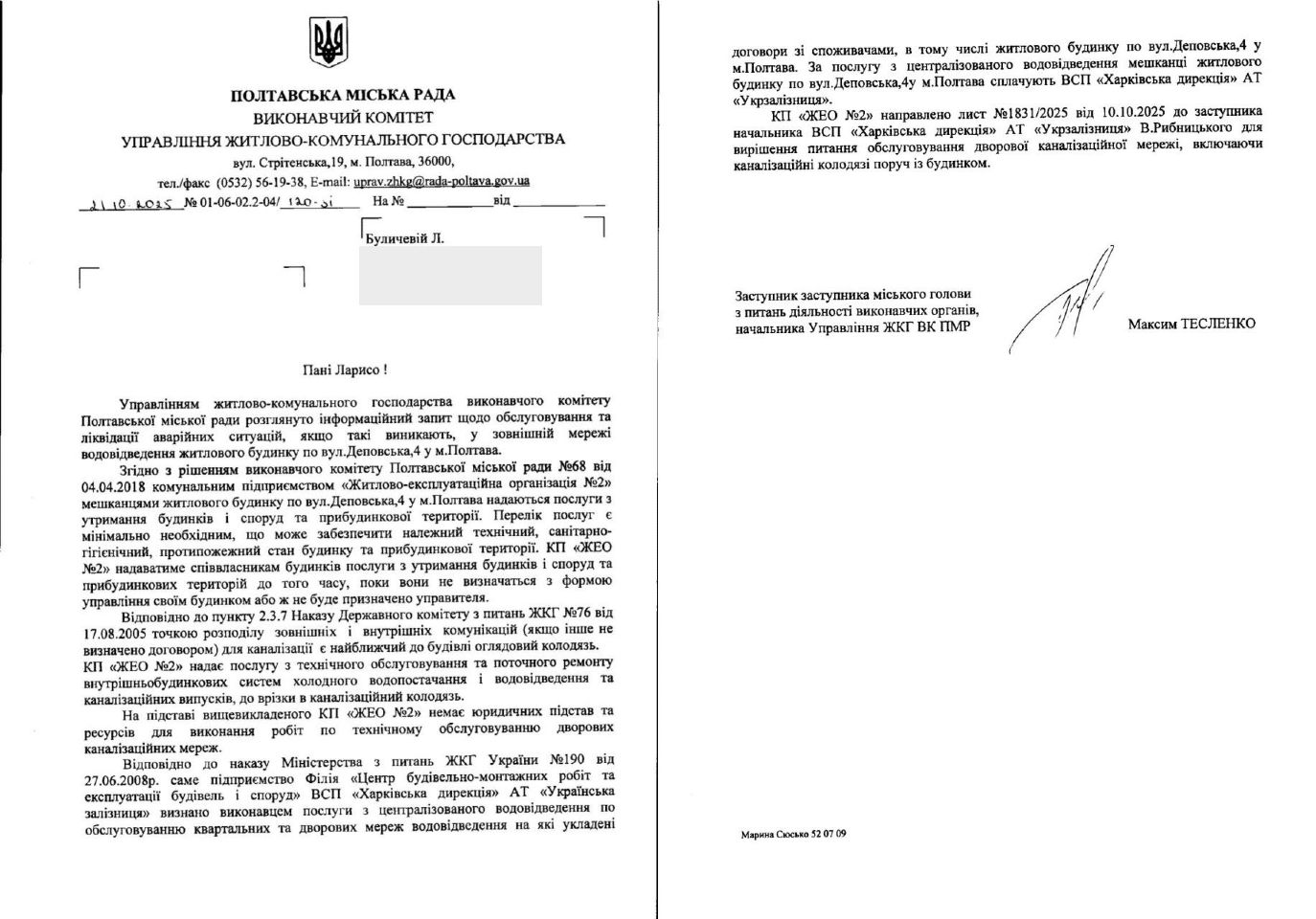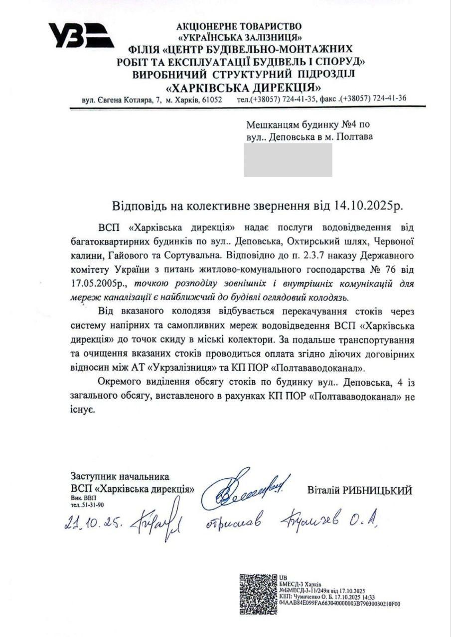 «Полтававодоканал» та КП «ЖЕО №2» порадили мешканцям звернутися до надавача послуг — Харківської дирекції «Укрзалізниці». Остання не проводить жодних дій.