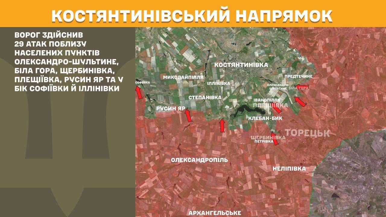 На Костянтинівському напрямку ворог здійснив 29 атак поблизу населених пунктів Олександро-Шультине, Біла Гора, Щербинівка, Плещіївка, Русин Яр та у бік Софіївки й Іллінівки.