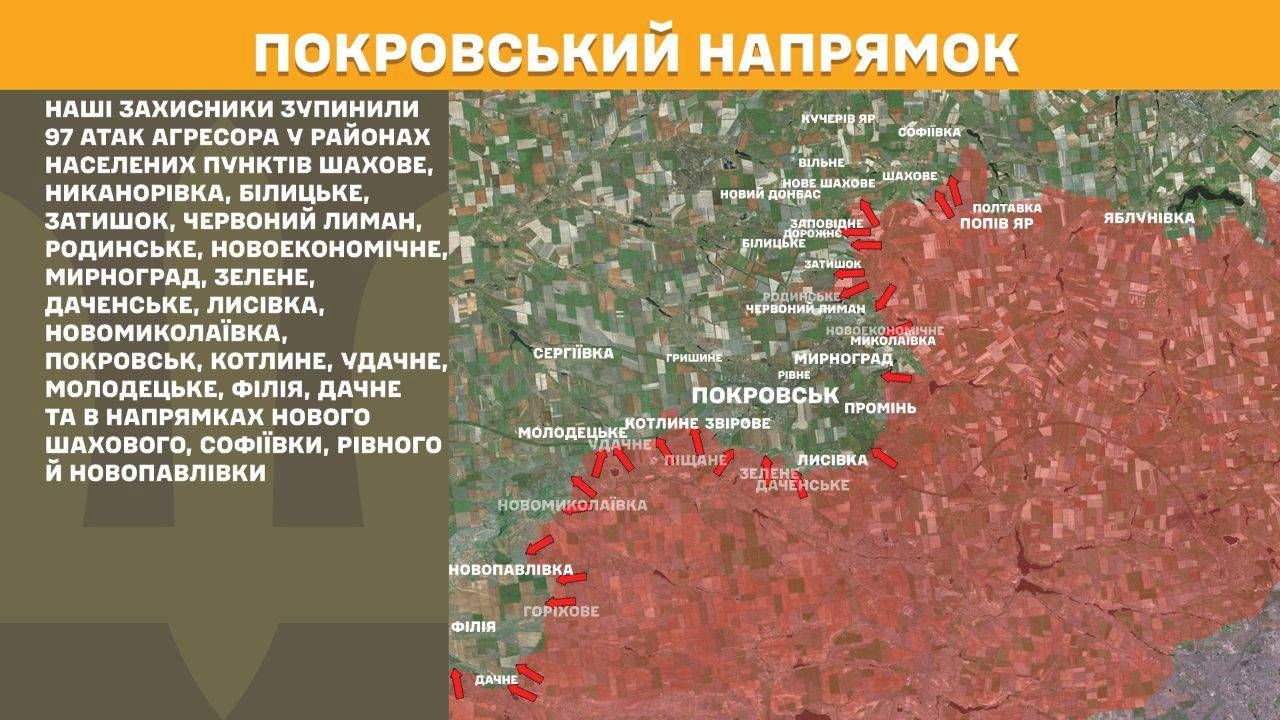 На Покровському напрямку наші захисники зупинили 97 атак агресора у районах населених пунктів Шахове, Никанорівка, Білицьке, Затишок, Червоний Лиман, Родинське, Новоекономічне, Мирноград, Зелене, Даченське, Лисівка, Новомиколаївка, Покровськ, Котлине, Удачне, Молодецьке, Філія, Дачне та в напрямках Нового Шахового, Софіївки, Рівного й Новопавлівки.