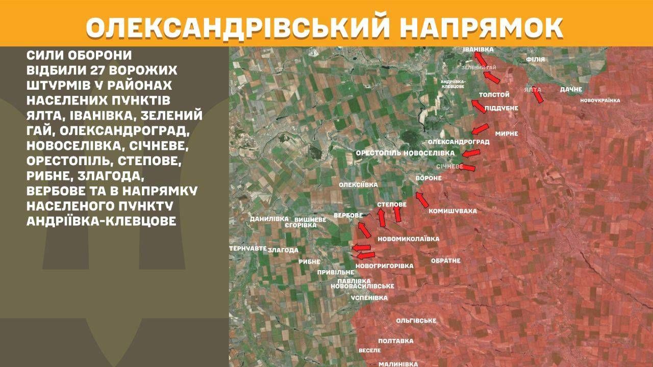 На Олександрівському напрямку Сили оборони відбили 27 ворожих штурмів у районах населених пунктів Ялта, Іванівка, Зелений Гай, Олександроград, Новоселівка, Січневе, Орестопіль, Степове, Рибне, Злагода, Вербове та в напрямку населеного пункту Андріївка-Клевцове.