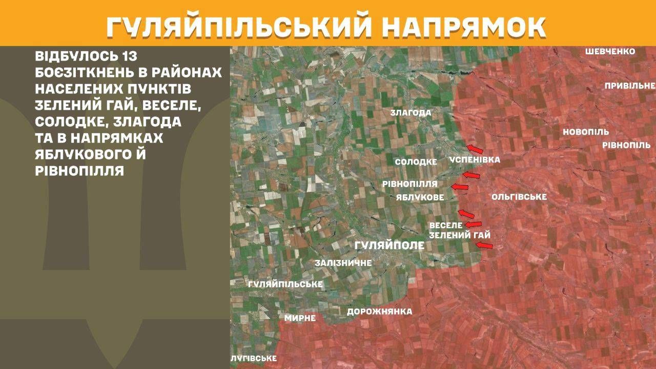 На Гуляйпільському напрямку відбулось 13 боєзіткнень в районах населених пунктів Зелений Гай, Веселе, Солодке, Злагода та в напрямках Яблукового й Рівнопілля.