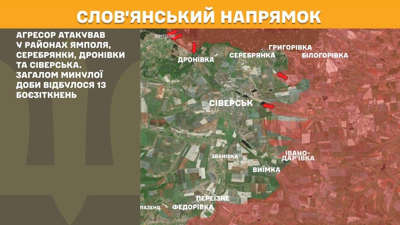 На Слов’янському напрямку агресор атакував у районах Ямполя, Серебрянки, Дронівки та Сіверська. Загалом минулої доби відбулося 13 боєзіткнень.