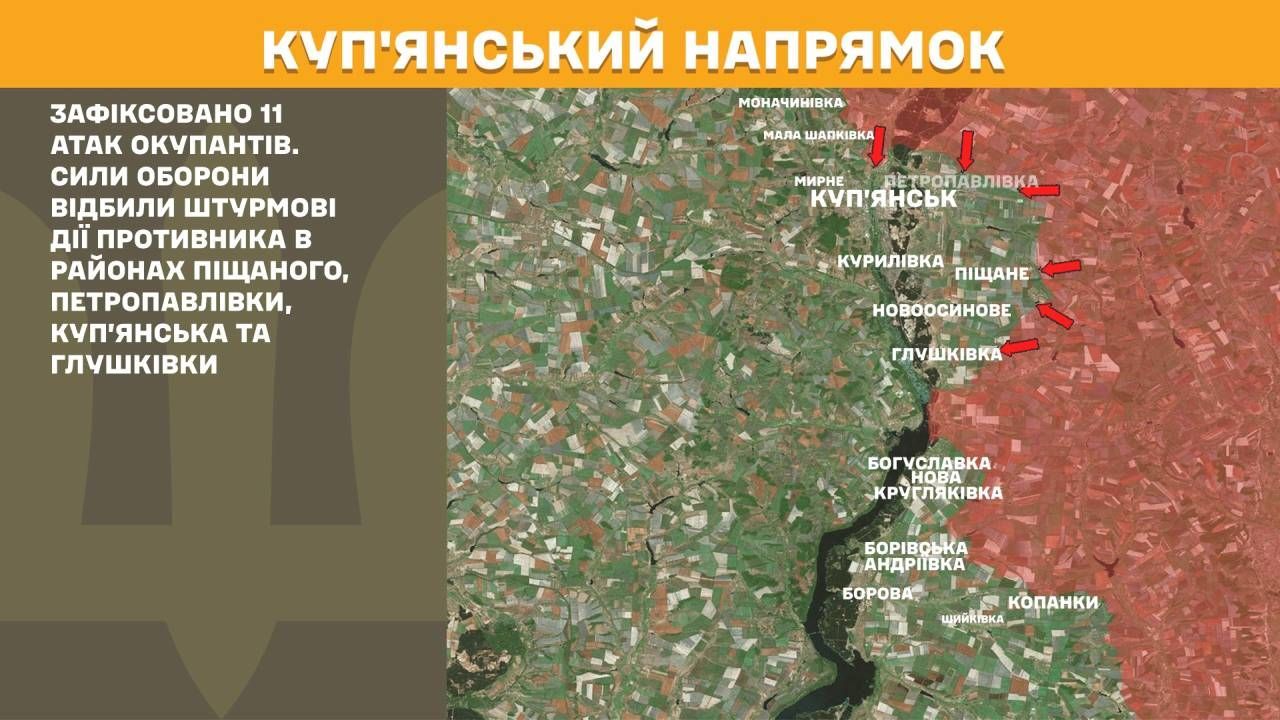 На Куп’янському напрямку за добу зафіксовано 11 атак окупантів. Сили оборони відбили штурмові дії противника в районах Піщаного, Петропавлівки, Куп’янська та Глушківки.