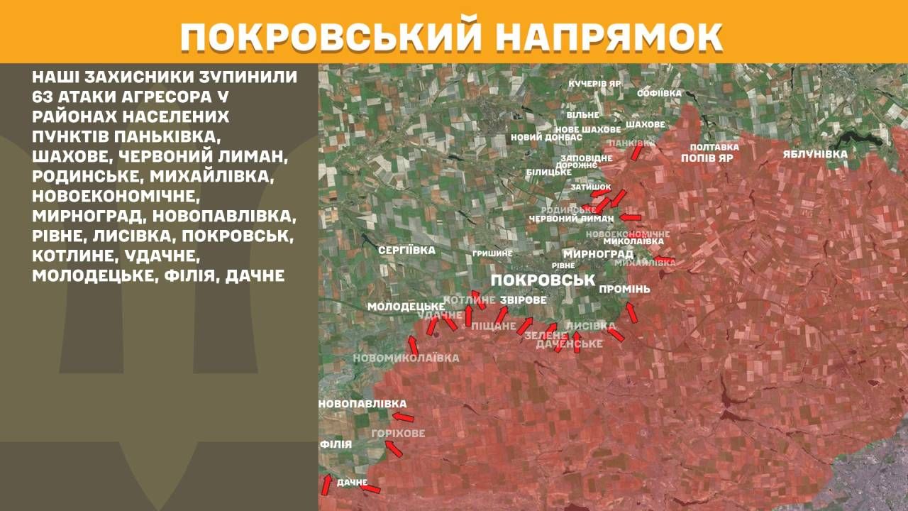 На Покровському напрямку наші захисники зупинили 63 атаки агресора у районах населених пунктів Паньківка, Шахове, Червоний Лиман, Родинське, Михайлівка, Новоекономічне, Мирноград, Новопавлівка, Рівне, Лисівка, Покровськ, Котлине, Удачне, Молодецьке, Філія, Дачне.