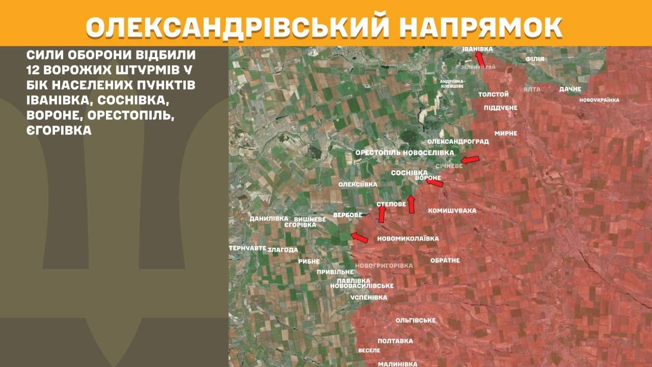 На Олександрівському напрямку Сили оборони відбили 12 ворожих штурмів у бік населених пунктів Іванівка, Соснівка, Вороне, Орестопіль, Єгорівка.