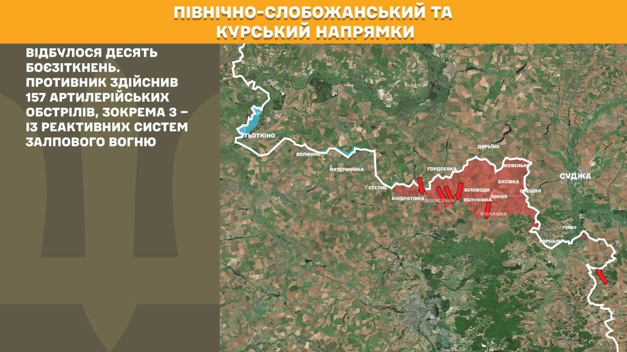 На Північно-Слобожанському і Курському напрямках минулої доби відбулося десять боєзіткнень. Противник здійснив 157 артилерійських обстрілів, зокрема 3 – із реактивних систем залпового вогню.