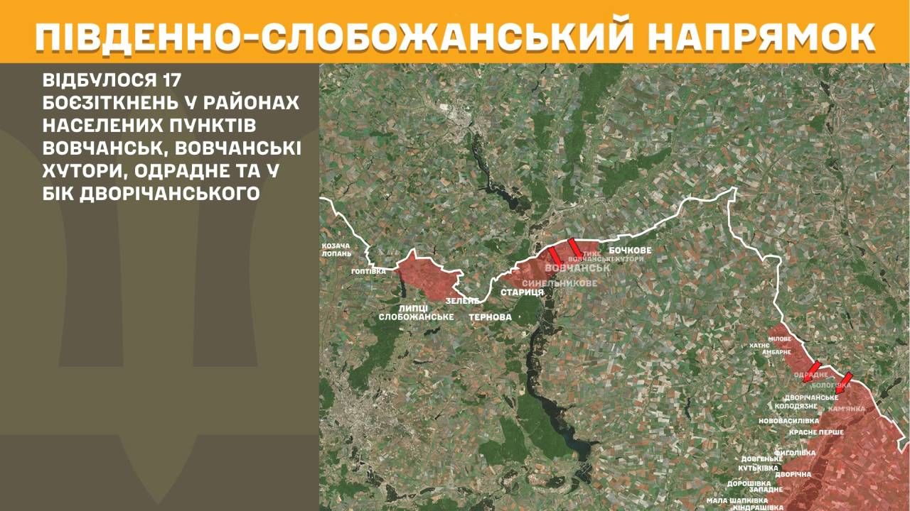 На Південно-Слобожанському напрямку відбулося 17 боєзіткнень у районах населених пунктів Вовчанськ, Вовчанські Хутори, Одрадне та у бік Дворічанського.