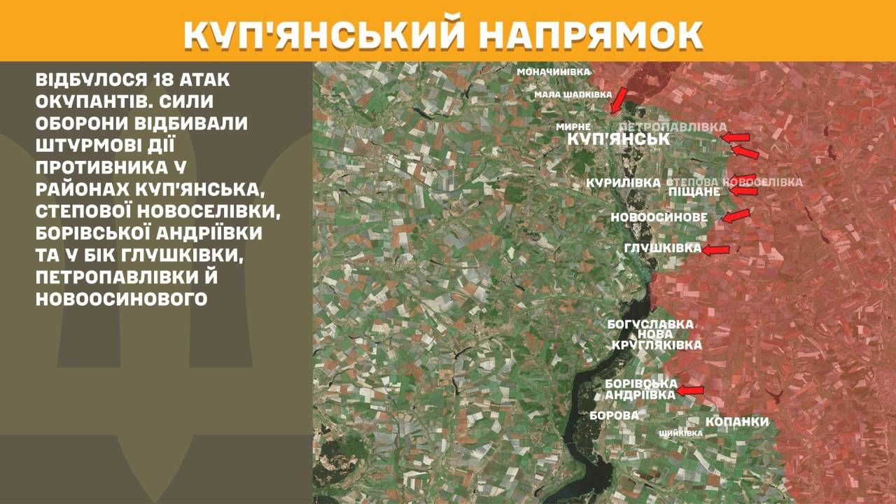 На Куп’янському напрямку минулої доби відбулося 18 атак окупантів. Сили оборони відбивали штурмові дії противника у районах Куп’янська, Степової Новоселівки, Борівської Андріївки та у бік Глушківки, Петропавлівки й Новоосинового.