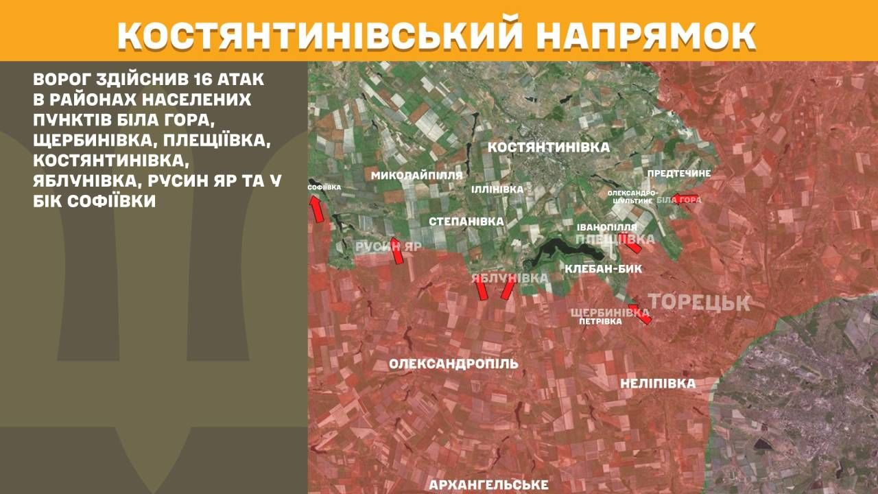 На Костянтинівському напрямку ворог здійснив 16 атак в районах населених пунктів Біла Гора, Щербинівка, Плещіївка, Костянтинівка, Яблунівка, Русин Яр та у бік Софіївки.