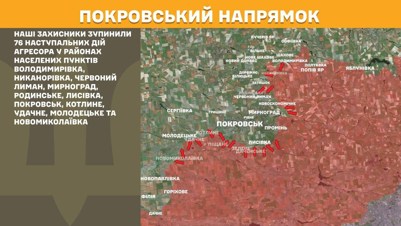 На Покровському напрямку наші захисники зупинили 76 наступальних дій агресора у районах населених пунктів Володимирівка, Никанорівка, Червоний Лиман, Мирноград, Родинське, Лисівка, Покровськ, Котлине, Удачне, Молодецьке та Новомиколаївка.
