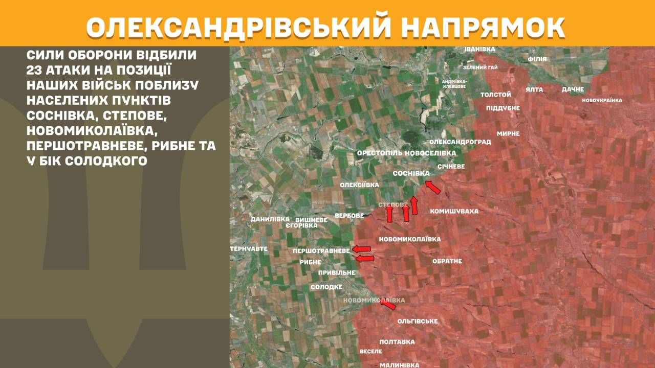 На Олександрівському напрямку Сили оборони відбили 23 атаки на позиції наших військ поблизу населених пунктів Соснівка, Степове, Новомиколаївка, Першотравневе, Рибне та у бік Солодкого.