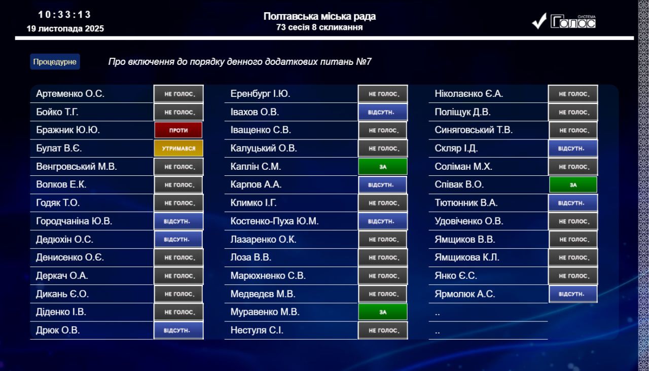 10:15 — Голова Полтавської ТВК Алла Назаренко зачитала постанову комісії від 10 листопада щодо реєстрації депутатом Полтавської міської ради В’ячеслава Тютюнника (по списку партії «Слуга народу»), який замінить депутата Марину Пілатову.