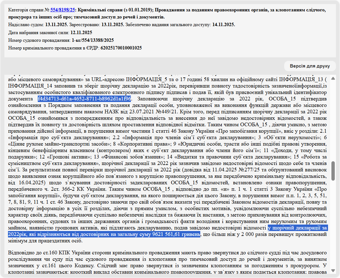 Слідство встановило, що у щорічній декларації за 2021 рік посадовець приховав статки на суму понад 7,7 млн грн, а у декларації за 2022 рік розбіжність склала вже понад 9,6 млн грн. Дії кваліфіковано за ч. 2 ст. 366-2 КК України (Умисне внесення суб’єктом декларування завідомо недостовірних відомостей до декларації).