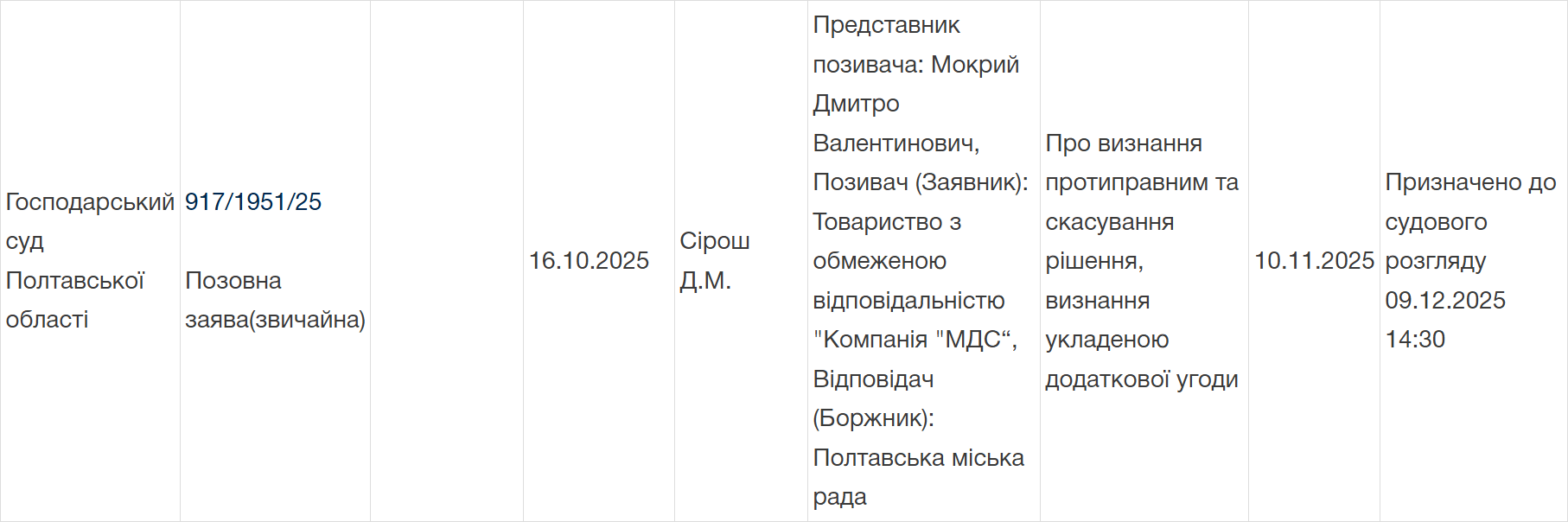 ТОВ «Компанія «МДС» подала до Господарського суду Полтавської області позов проти Полтавської міськради про визнання протиправним та скасування рішення, визнання укладеною додаткової угоди. Судове засідання під головуванням судді Дмитра Сіроша призначене на 9 грудня поточного року.