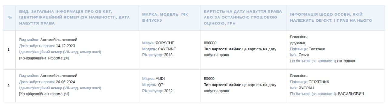 Ольга Телятник заплатила за автомобіль 800 тис. грн, хоча Porsche Cayenne 2018 року у грудні 2023-го в Україні коштував орієнтовно від 2,2 до 3,3 млн грн, залежно від моделі, пробігу та комплектації.