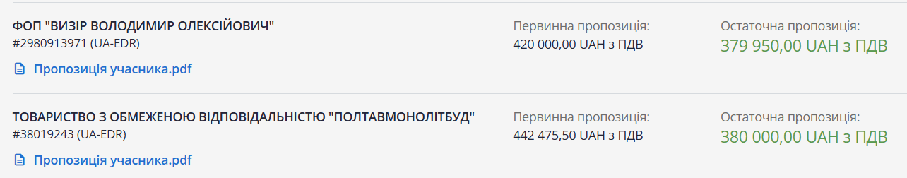 Цікаво, що тендерний комітет відхилив дешевшу пропозицію місцевого підприємця Володимира Визіра, яка була меншою на 50 грн. Причина — учасник не подав повний комплект документів: реєстрацію юрособи, витяг з реєстру платників єдиного податку, а також цінову пропозицію у формі таблиці.