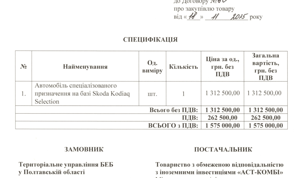 Повторно процедуру оголосили у листопаді. Цього разу пропозиція ТОВ «АСТ-Комбі» відповідала умовам закупівлі, і з компанією уклали договір на придбання Skoda Kodiaq Selection сірого кольору 2025 року випуску вартістю 1 млн 575 тис. грн. За договором автомобіль мають доставити до 10 грудня.