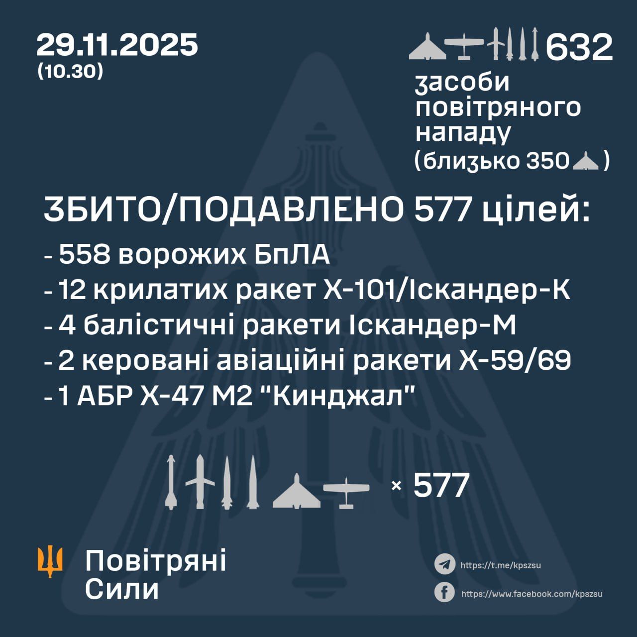 У ніч на 29 листопада (з 18:00 28 листопада) противник завдав комбінованого удару по об'єктах критичної інфраструктури України із застосуванням ударних БпЛА, ракет повітряного та наземного базування.