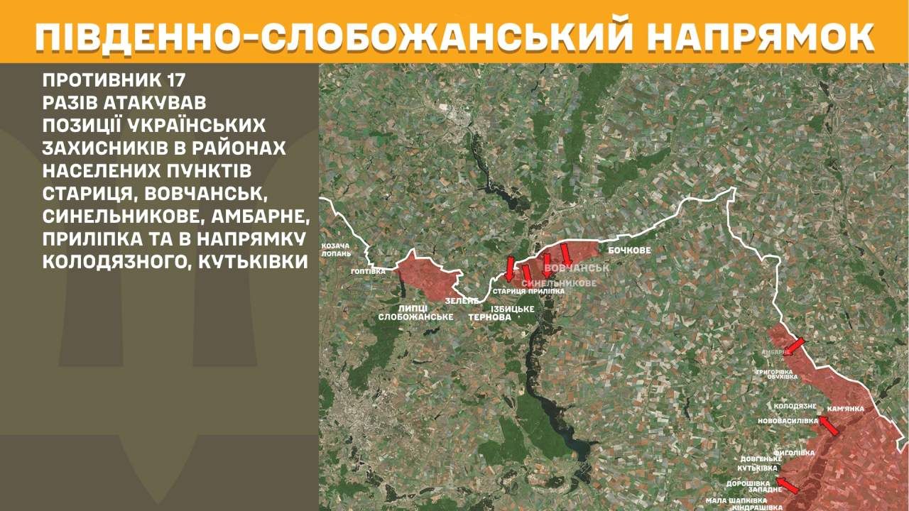 На Південно-Слобожанському напрямку противник 17 разів атакував позиції українських захисників в районах населених пунктів Стариця, Вовчанськ, Синельникове, Амбарне, Приліпка та в напрямку Колодязного, Кутьківки.