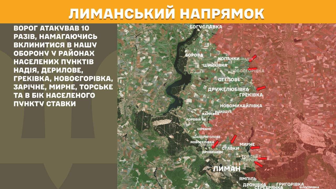 На Лиманському напрямку ворог атакував 10 разів, намагаючись вклинитися в нашу оборону у районах населених пунктів Надія, Дерилове, Греківка, Новоєгорівка, Зарічне, Мирне, Торське та в бік населеного пункту Ставки.