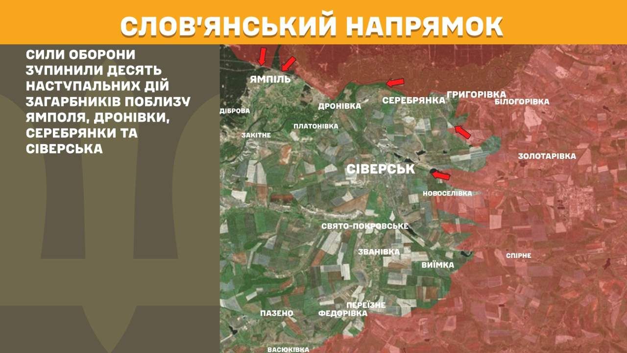 На Слов’янському напрямку Сили оборони зупинили десять наступальних дій загарбників поблизу Ямполя, Дронівки, Серебрянки та Сіверська.