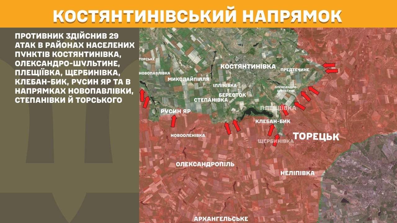На Костянтинівському напрямку противник здійснив 29 атак в районах населених пунктів Костянтинівка, Олександро-Шультине, Плещіївка, Щербинівка, Клебан-Бик, Русин Яр та в напрямках Новопавлівки, Степанівки й Торського.