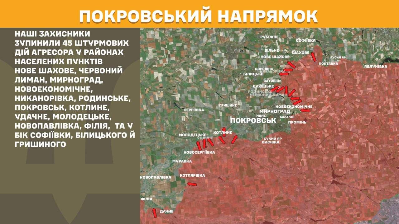 На Покровському напрямку наші захисники зупинили 45 штурмових дій агресора у районах населених пунктів Нове Шахове, Червоний Лиман, Мирноград, Новоекономічне, Никанорівка, Родинське, Покровськ, Котлине, Удачне, Молодецьке, Новопавлівка, Філія, та у бік Софіївки, Білицького й Гришиного.