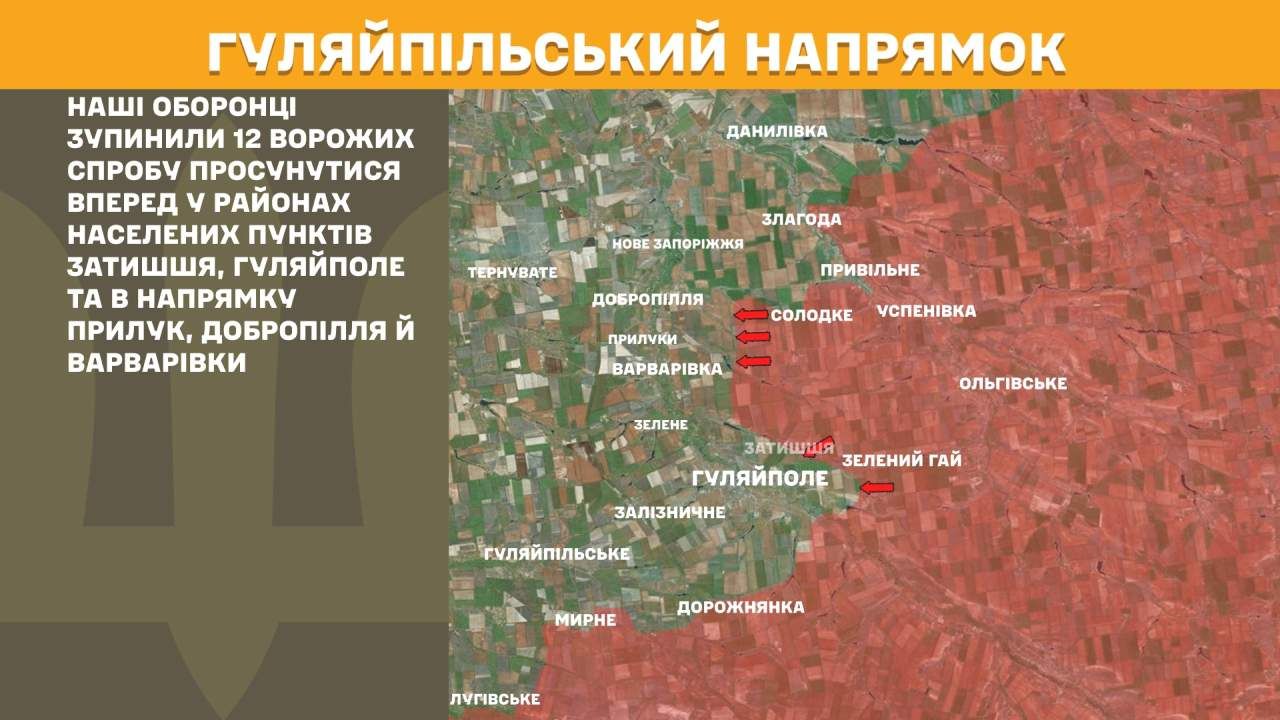 На Гуляйпільському напрямку наші оборонці зупинили 12 ворожих спроб просунутися вперед у районах населених пунктів Затишшя, Гуляйполе та в напрямку Прилук, Добропілля й Варварівки.