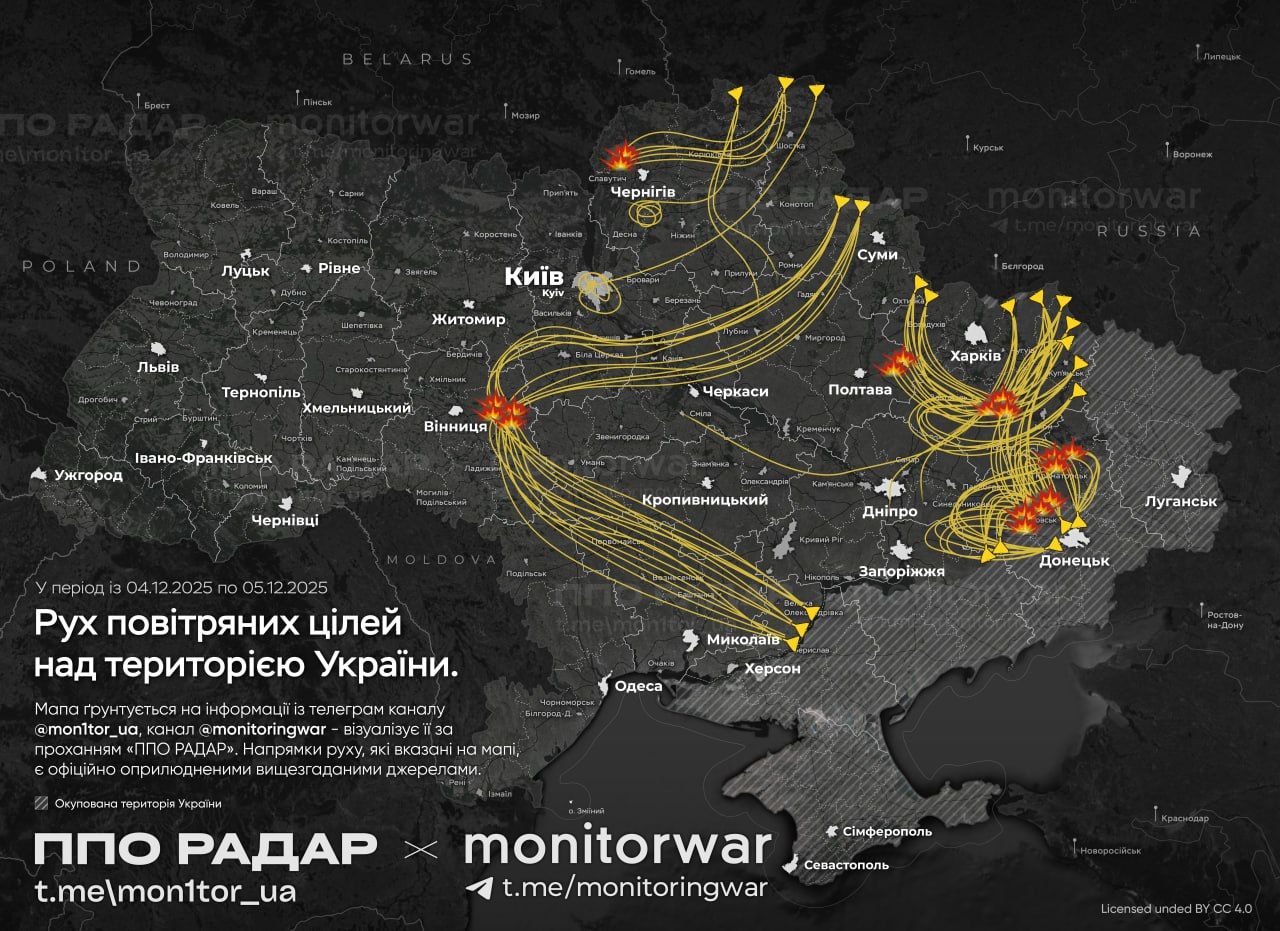 У ніч на 5 грудня (з 19:00 4 грудня) противник атакував 137-ма ударними БпЛА типу Shahed, Гербера і безпілотниками інших типів із напрямків: Курськ, Орел, Міллерово, Приморсько-Ахтарськ – рф, Чауда - ТОТ АР Крим, близько 90 із них – "шахеди".