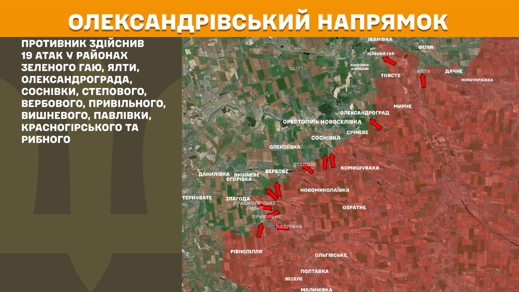На Олександрівському напрямку противник вчора здійснив 19 атак у районах Зеленого Гаю, Ялти, Олександрограда, Соснівки, Степового, Вербового, Привільного, Вишневого, Павлівки, Красногірського та Рибного.