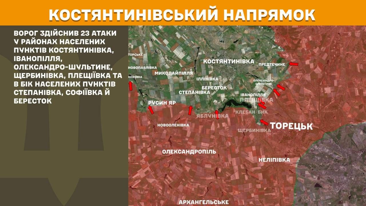 На Костянтинівському напрямку ворог здійснив 23 атаки у районах населених пунктів Костянтинівка, Іванопілля, Олександро-Шультине, Щербинівка, Плещіївка та в бік населених пунктів Степанівка, Софіївка й Бересток.