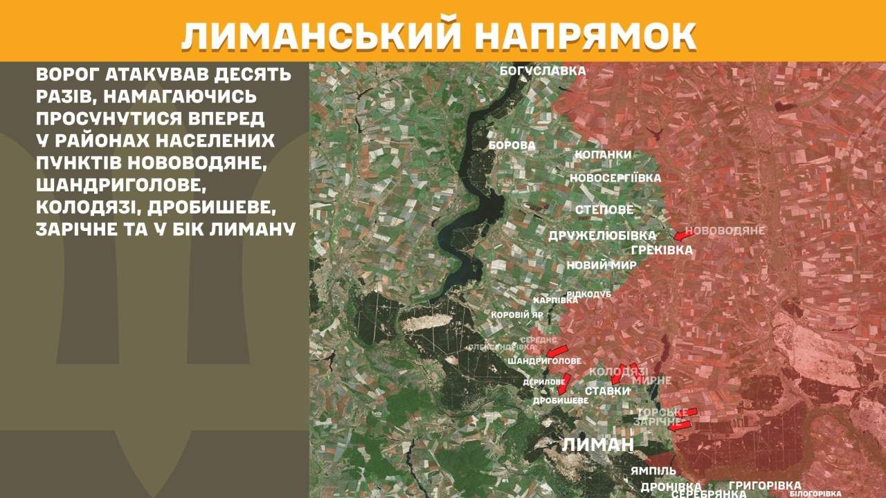 На Лиманському напрямку ворог атакував десять разів, намагаючись просунутися вперед у районах населених пунктів Нововодяне, Шандриголове, Колодязі, Дробишеве, Зарічне та у бік Лиману.