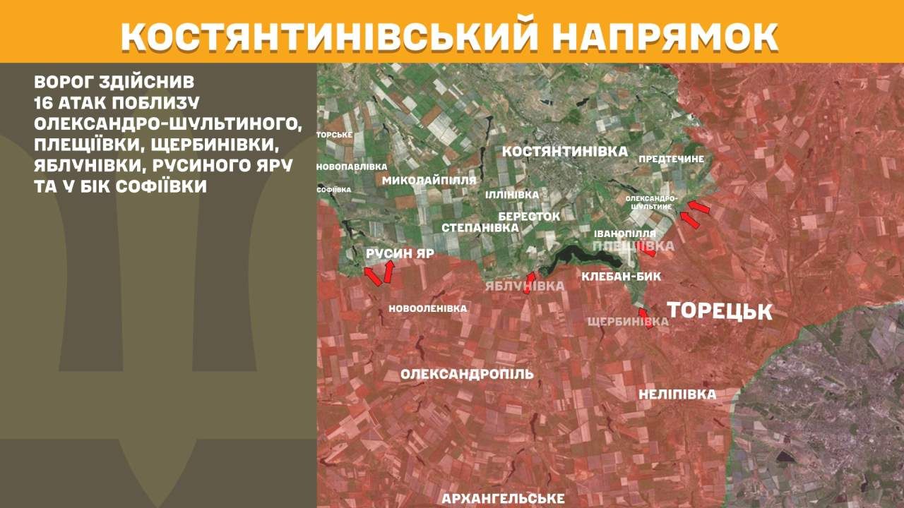 На Костянтинівському напрямку ворог здійснив 16 атак поблизу Олександро-Шультиного, Плещіївки, Щербинівки, Яблунівки, Русиного Яру та у бік Софіївки.