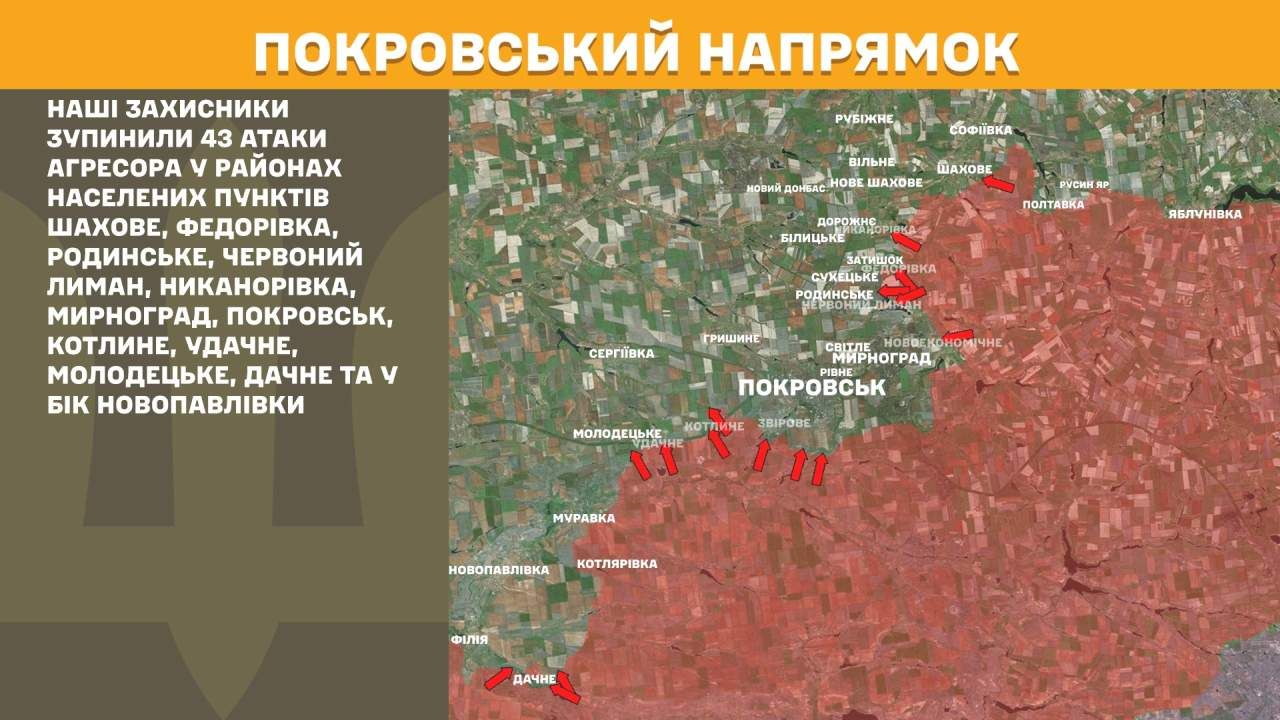 На Покровському напрямку наші захисники зупинили 43 атаки агресора у районах населених пунктів Шахове, Федорівка, Родинське, Червоний Лиман, Никанорівка, Мирноград, Покровськ, Котлине, Удачне, Молодецьке, Дачне та у бік Новопавлівки.