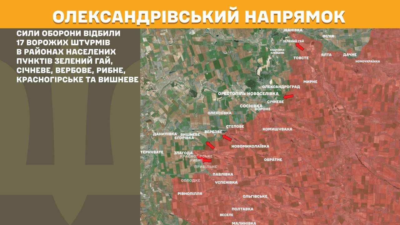 На Олександрівському напрямку Сили оборони відбили 17 ворожих штурмів в районах населених пунктів Зелений Гай, Січневе, Вербове, Рибне, Красногірське та Вишневе.