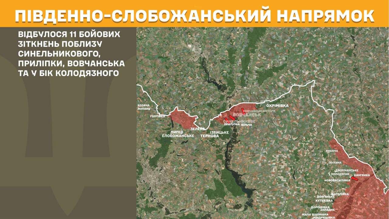 На Південно-Слобожанському напрямку вчора відбулося 11 бойових зіткнень поблизу Синельникового, Приліпки, Вовчанська та у бік Колодязного.