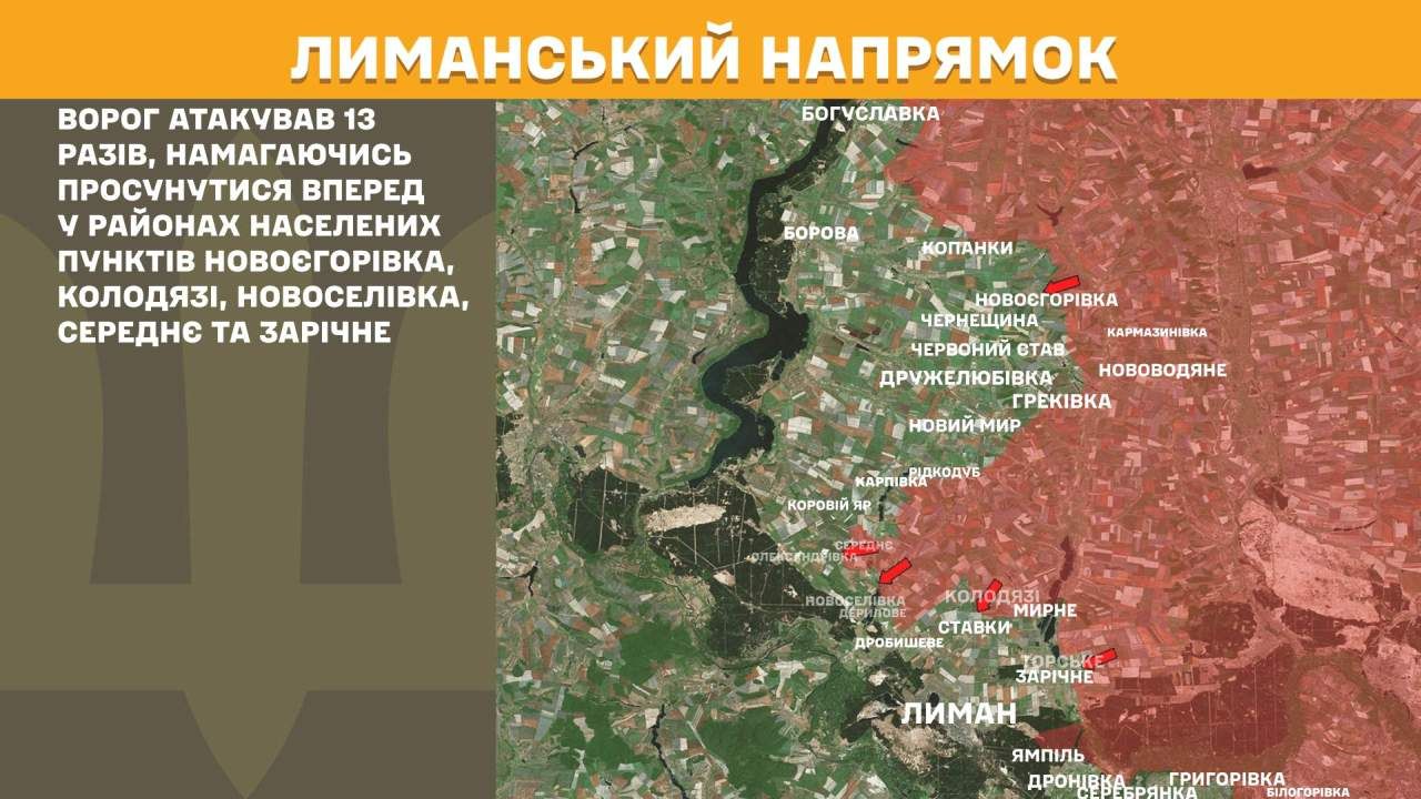 На Лиманському напрямку ворог атакував 13 разів, намагаючись просунутися вперед у районах населених пунктів Новоєгорівка, Колодязі, Новоселівка, Середнє та Зарічне.