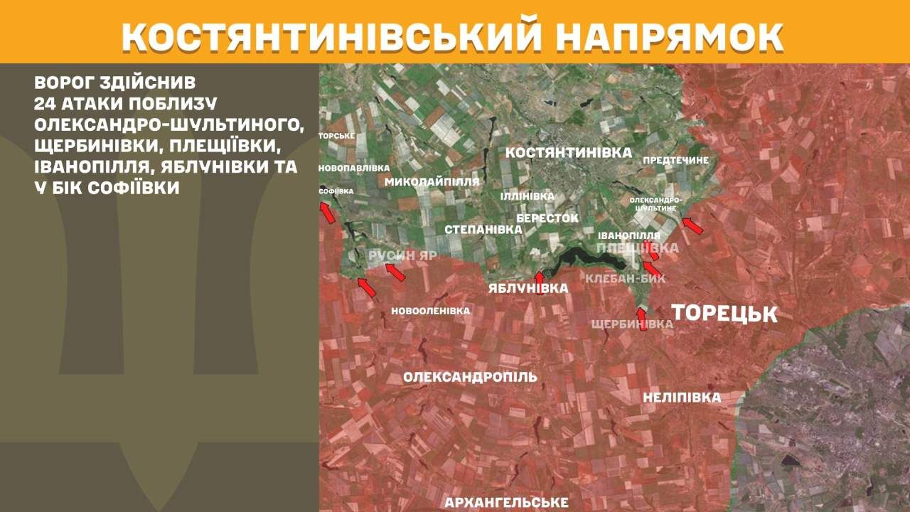 На Костянтинівському напрямку ворог здійснив 24 атаки поблизу Олександро-Шультиного, Щербинівки, Плещіївки, Іванопілля, Яблунівки та у бік Софіївки.