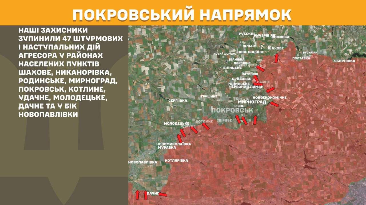 На Покровському напрямку наші захисники зупинили 47 штурмових і наступальних дій агресора у районах населених пунктів Шахове, Никанорівка, Родинське, Мирноград, Покровськ, Котлине, Удачне, Молодецьке, Дачне та у бік Новопавлівки.
