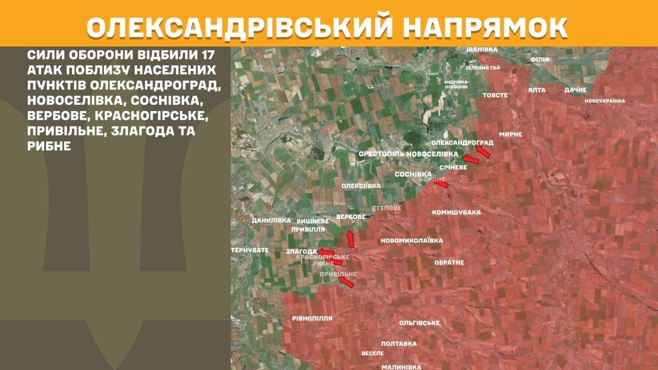 На Олександрівському напрямку Сили оборони відбили 17 атак поблизу населених пунктів Олександроград, Новоселівка, Соснівка, Вербове, Красногірське, Привільне, Злагода та Рибне.