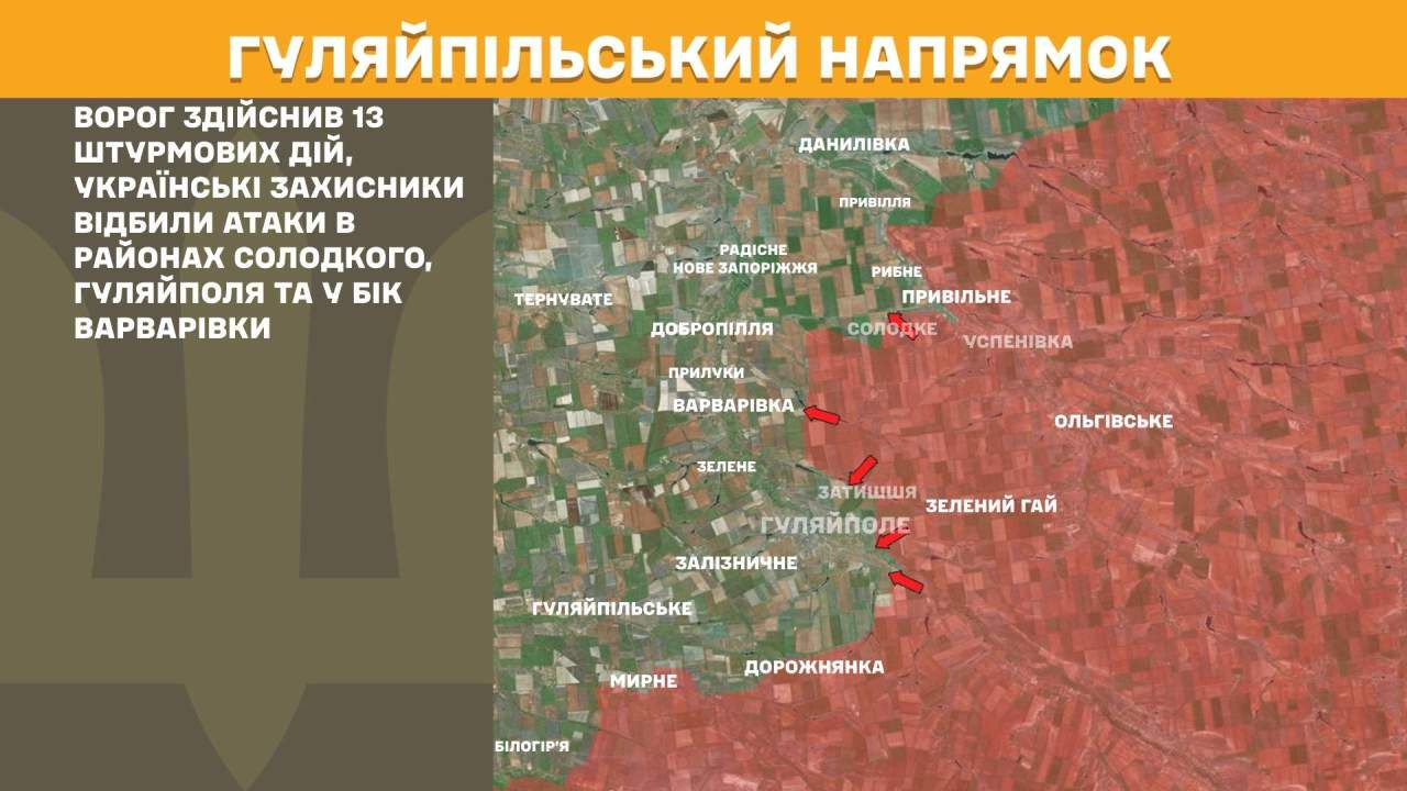 На Гуляйпільському напрямку ворог здійснив 13 штурмових дій, українські захисники відбили атаки в районах Солодкого, Гуляйполя та у бік Варварівки.