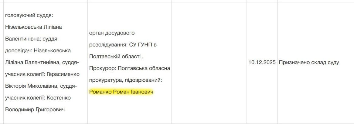 Як стало відомо «Полтавщині» з власних джерел, 10 грудня 2025 року Полтавський апеляційний суд обрав запобіжний захід Роману Романку, який є спільником голови неврологічної медичної команди — чоловіка взяли під варту. Водночас суд призначив йому заставу — 250 тис. грн.