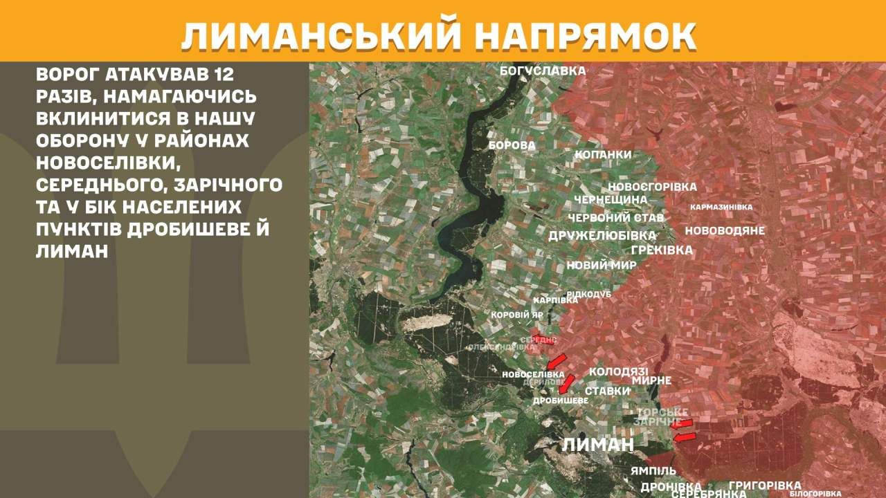На Лиманському напрямку ворог атакував 12 разів, намагаючись вклинитися в нашу оборону у районах Новоселівки, Середнього, Зарічного та у бік населених пунктів Дробишеве й Лиман.